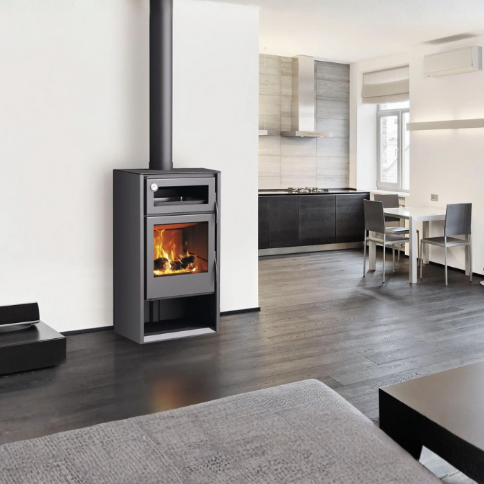 Επάνω φούρνος από ατσάλι, με ενσωματωμένο θερμόμετρο. Περιλαμβάνει ταψί ψησίματος, επιτρέποντας να μαγειρεύετε ή να ψήνετε αξιοποιώντας τη θερμότητα της σόμπας.
